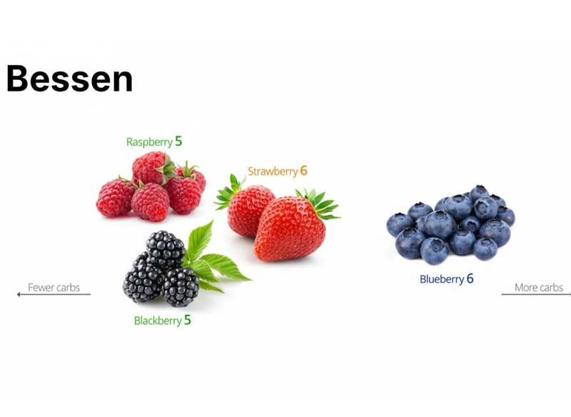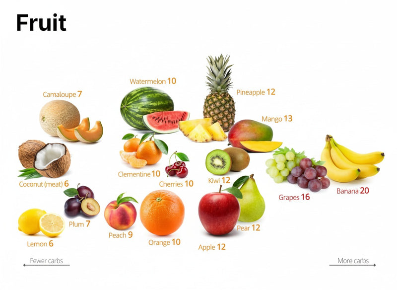 De getallen naast elke vrucht (bijv. watermeloen 10, banaan 20, framboos 5) geven de hoeveelheid netto koolhydraten per 100 gram fruit aan.